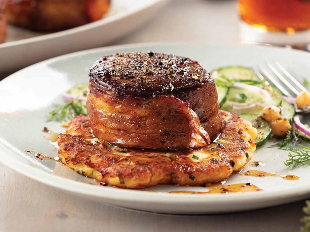 The Filet Mignon, center-cut and wrapped in smoked bacon, lands with a seared crust so clean it could have been drawn with a compass. Inside: supple, delicate beef, cooked precisely medium-rare. Paired with lobster tail as an add-on, the surf and turf reach near-operatic levels.